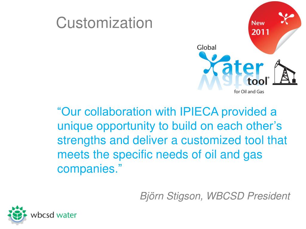 Customization “Our collaboration with IPIECA provided a unique opportunity to build on each other’s strengths and deliver a customized tool that meets the specific needs of oil and gas companies.” Björn Stigson, WBCSD President