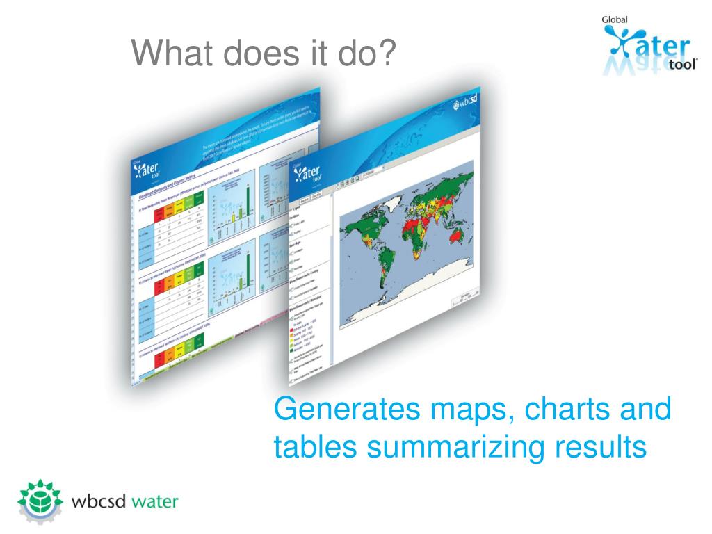 What does it do? Compares your company’s water use with validated water, sanitation, population and biodiversity information Establishes relative water risks in a company’s portfolio in order to prioritize action • Creates key water reporting indicators in addition to inventories, risk and performance metrics Enables effective communication with internal and external stakeholders
