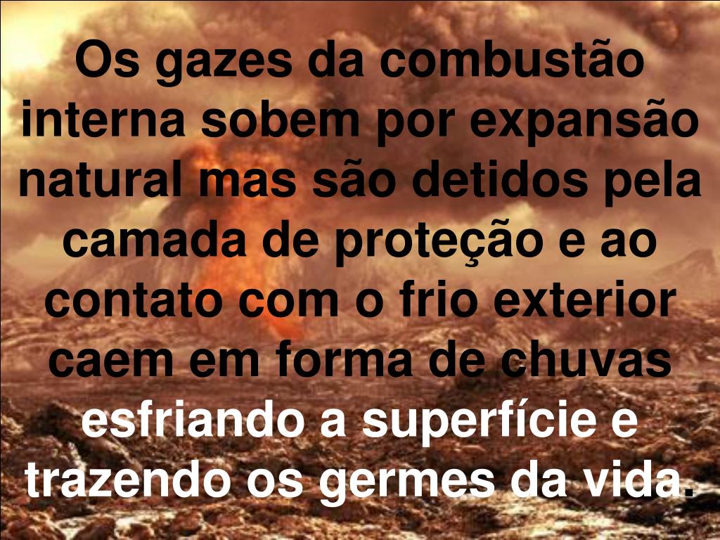 Os gazes da combustão interna sobem por expansão natural mas são detidos pela camada de proteção e ao contato com o frio exterior caem em forma de chuvas esfriando a superfície e trazendo os germes da vida.