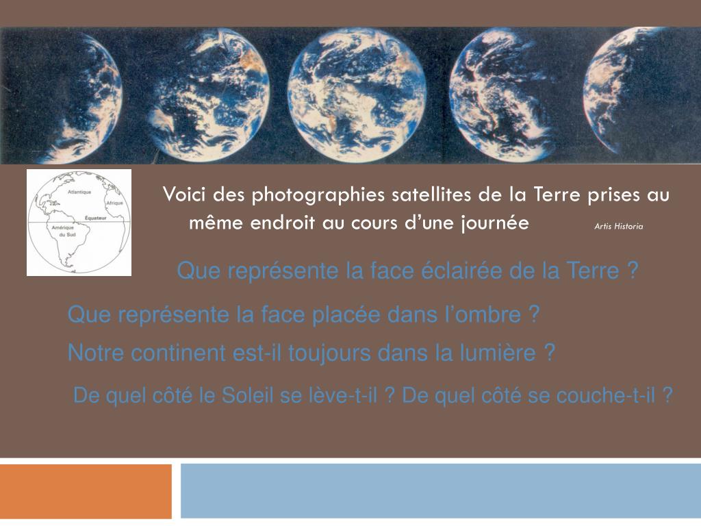 Voici des photographies satellites de la Terre prises au même endroit au cours d’une journée Artis Historia • Que représente la face éclairée de la Terre ? • Que représente la face placée dans l’ombre ? • Notre continent est-il toujours dans la lumière ? • De quel côté le Soleil se lève-t-il ? De quel côté se couche-t-il ?