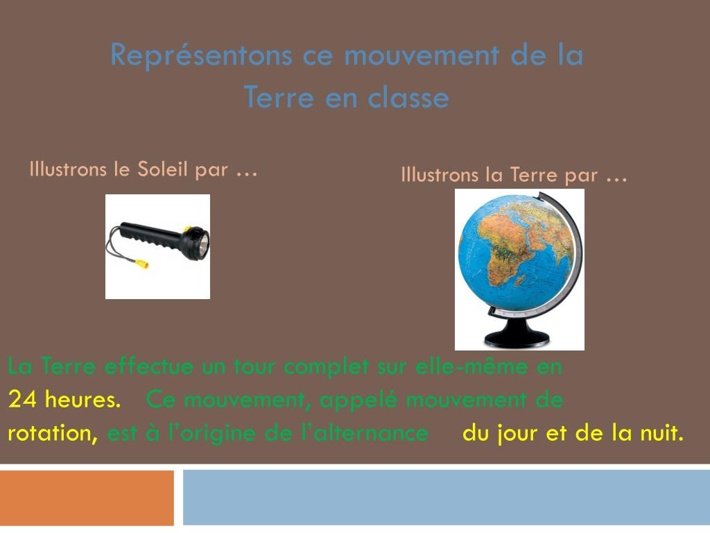 Représentons ce mouvement de la Terre en classe Illustrons le Soleil par … Illustrons la Terre par … La Terre effectue un tour complet sur elle-même en 24 heures. Ce mouvement, appelé mouvement de rotation, est à l’origine de l’alternance du jour et de la nuit.
