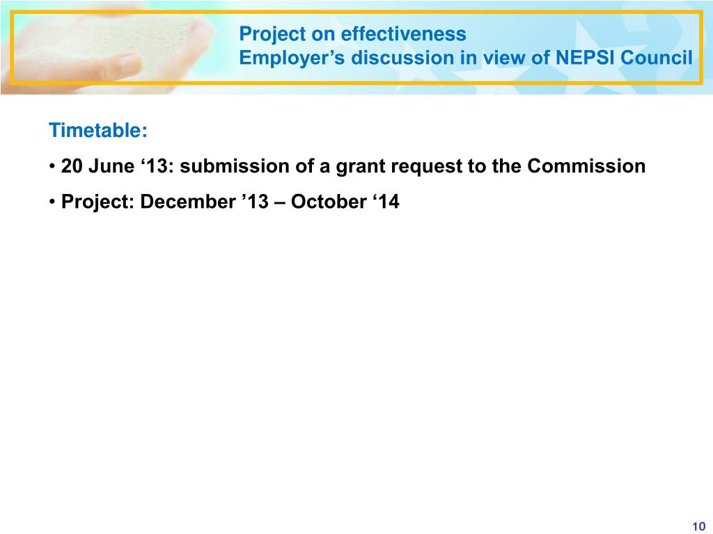 Project on effectiveness Employer’s discussion in view of NEPSI Council • Timetable: • 20 June ‘13: submission of a grant request to the Commission • Project: December ’13 – October ‘14