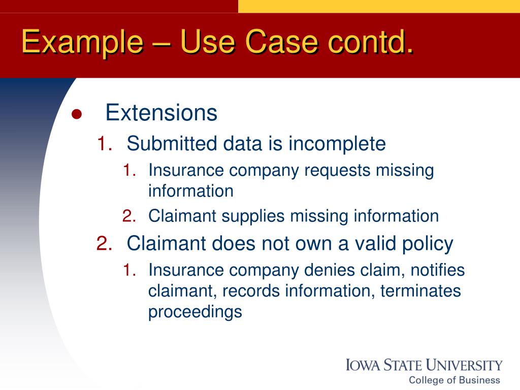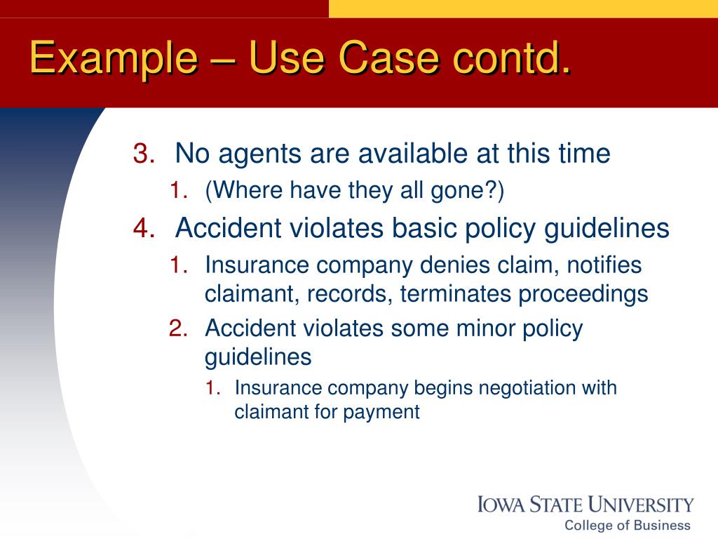 Example – Use Case contd. • No agents are available at this time • (Where have they all gone?) • Accident violates basic policy guidelines • Insurance company denies claim, notifies claimant, records, terminates proceedings • Accident violates some minor policy guidelines • Insurance company begins negotiation with claimant for payment