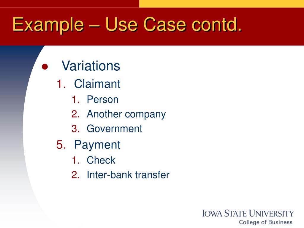 Example – Use Case contd. • Variations • Claimant • Person • Another company • Government • Payment • Check • Inter-bank transfer