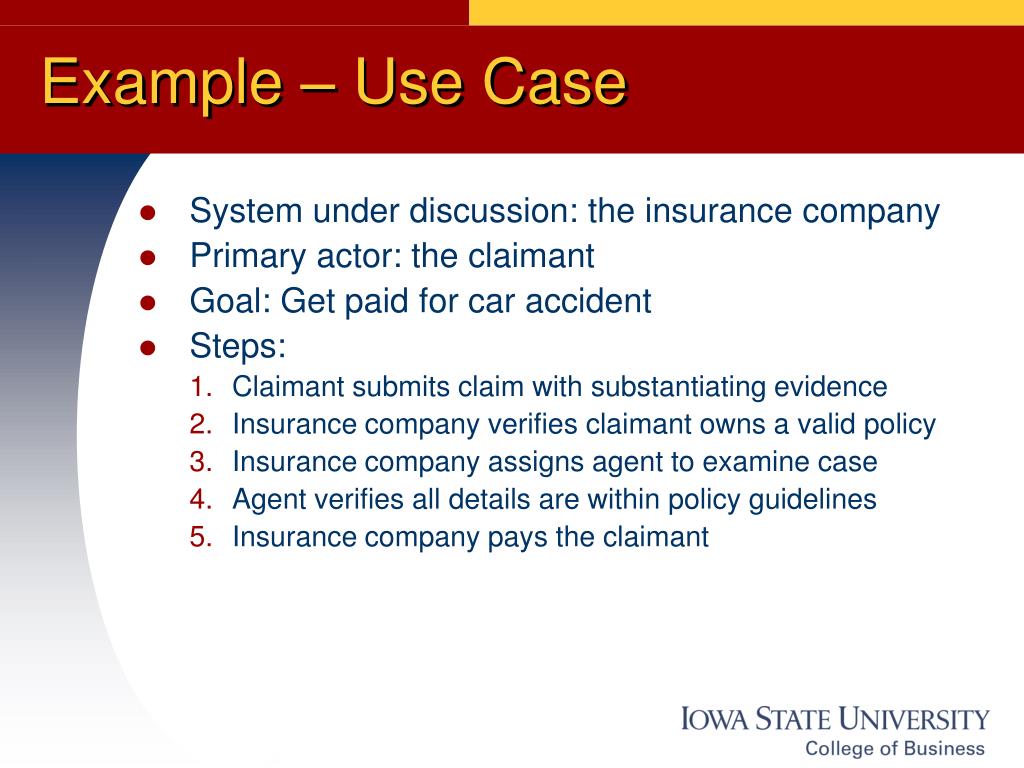 Example – Use Case • System under discussion: the insurance company • Primary actor: the claimant • Goal: Get paid for car accident • Steps: • Claimant submits claim with substantiating evidence • Insurance company verifies claimant owns a valid policy • Insurance company assigns agent to examine case • Agent verifies all details are within policy guidelines • Insurance company pays the claimant