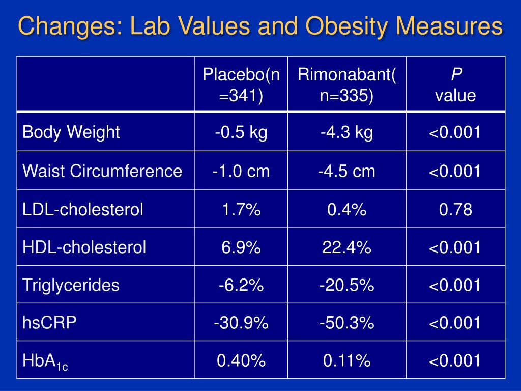 Conclusions • Treatment of abdominally-obese coronary disease patients for 18 months with rimonabant: • Reduced body weight 4.3 kg and waist circumference4.5 cm, increased HDL-C 22.4%, reduced triglycerides 20.5%, hsCRP 50.3%, and favorably affected HbA1c. • The study did not demonstrate an effect for rimonabant on the primary endpoint, PAV (P = 0.22), but a favorable effect for the secondary endpoint, TAV (P = 0.03). • Psychiatric and GI adverse effects were more common with rimonabant, which resulted in a higher rate of drug discontinuation.