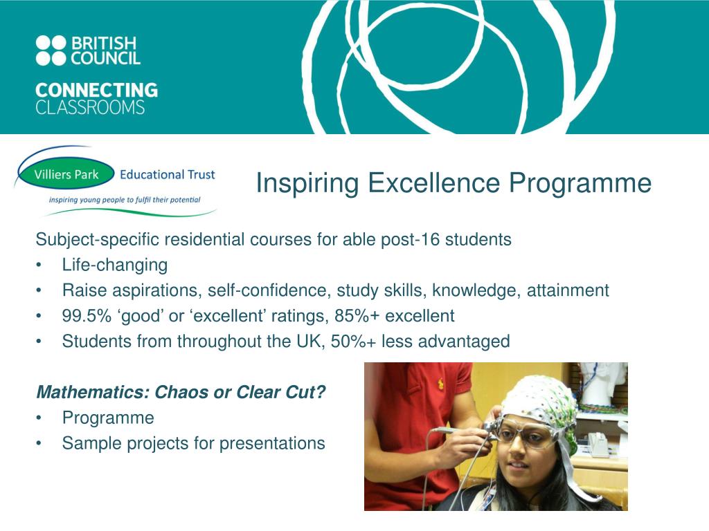 Inspiring Excellence Programme Subject-specific residential courses for able post-16 students • Life-changing • Raise aspirations, self-confidence, study skills, knowledge, attainment • 99.5% ‘good’ or ‘excellent’ ratings, 85%+ excellent • Students from throughout the UK, 50%+ less advantaged Mathematics: Chaos or Clear Cut? • Programme • Sample projects for presentations