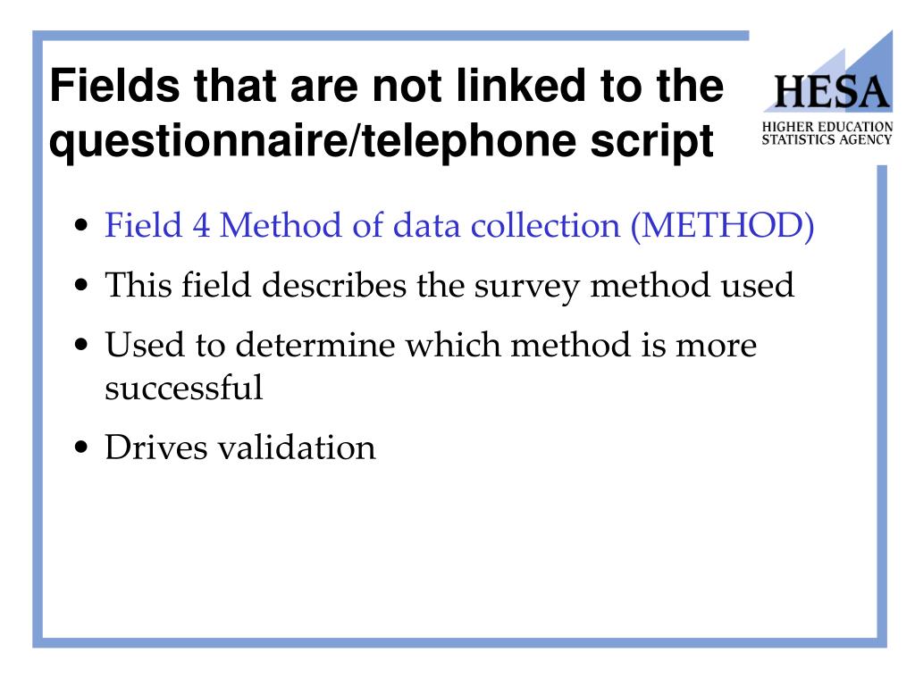 Fields that are not linked to the questionnaire/telephone script • Field 4 Method of data collection (METHOD) • This field describes the survey method used • Used to determine which method is more successful • Drives validation