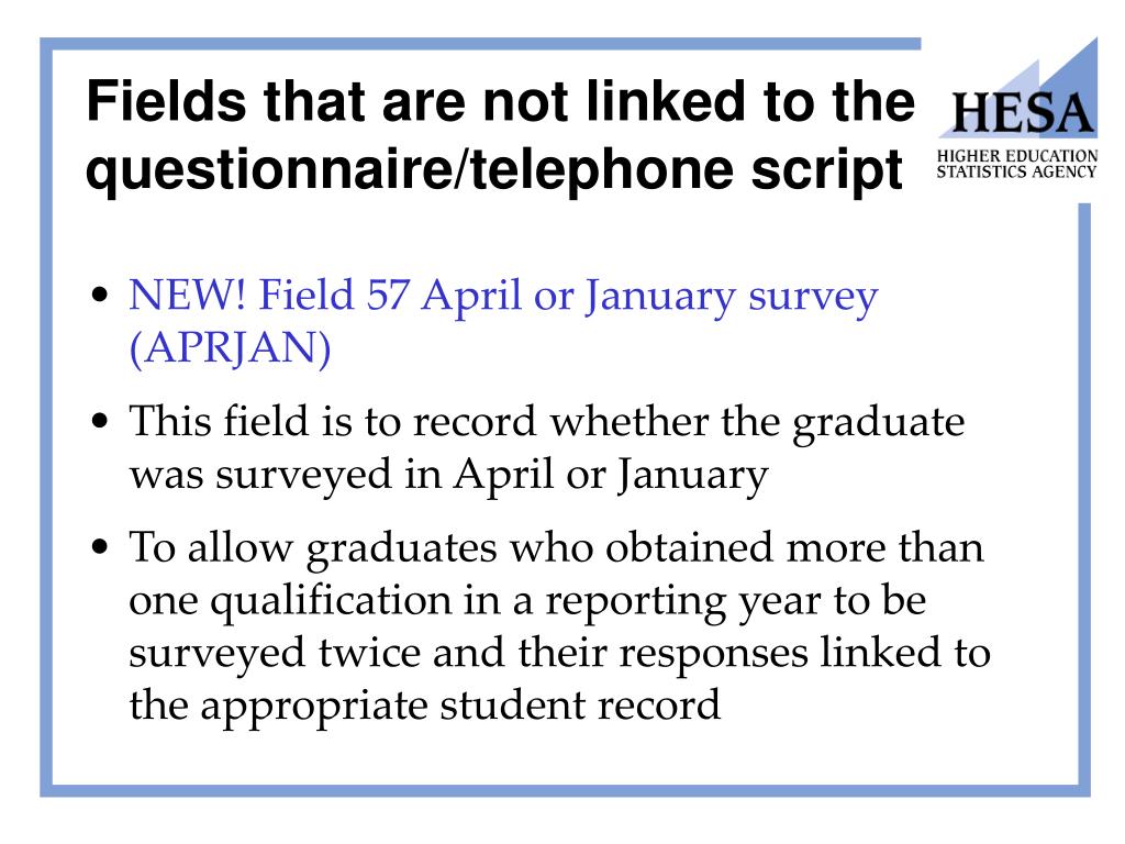 Fields that are not linked to the questionnaire/telephone script • NEW! Field 57 April or January survey (APRJAN) • This field is to record whether the graduate was surveyed in April or January • To allow graduates who obtained more than one qualification in a reporting year to be surveyed twice and their responses linked to the appropriate student record