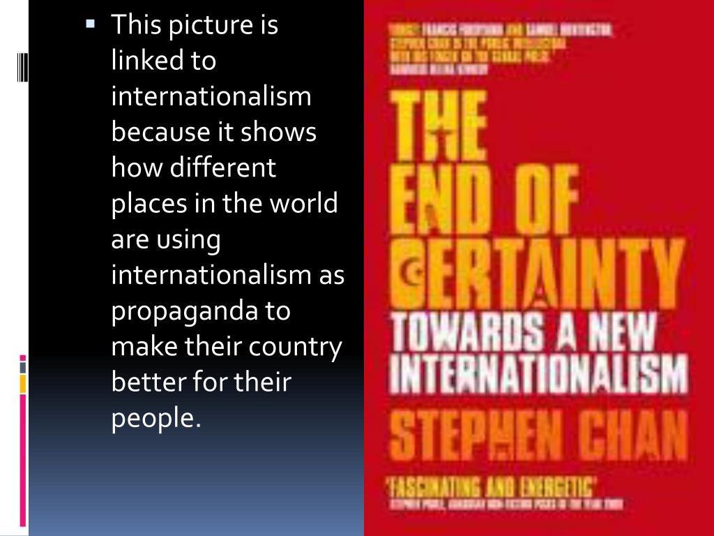 This shows a relation ship to internationalism because it is showing one of the extreme forms of perusing it. This kind of internationalism may or may not be violent but it makes the country to peruse their internationalisms