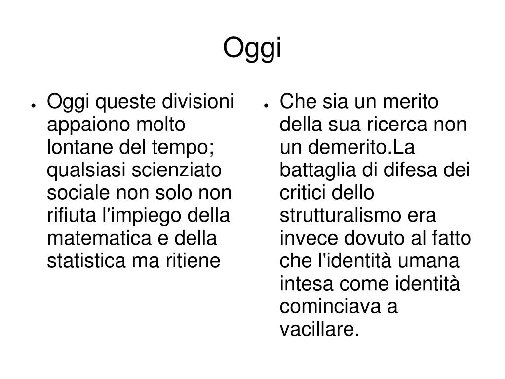 Che sia un merito della sua ricerca non un demerito.La battaglia di difesa dei critici dello strutturalismo era invece dovuto al fatto che l'identità umana intesa come identità cominciava a vacillare. Oggi • Oggi queste divisioni appaiono molto lontane del tempo; qualsiasi scienziato sociale non solo non rifiuta l'impiego della matematica e della statistica ma ritiene
