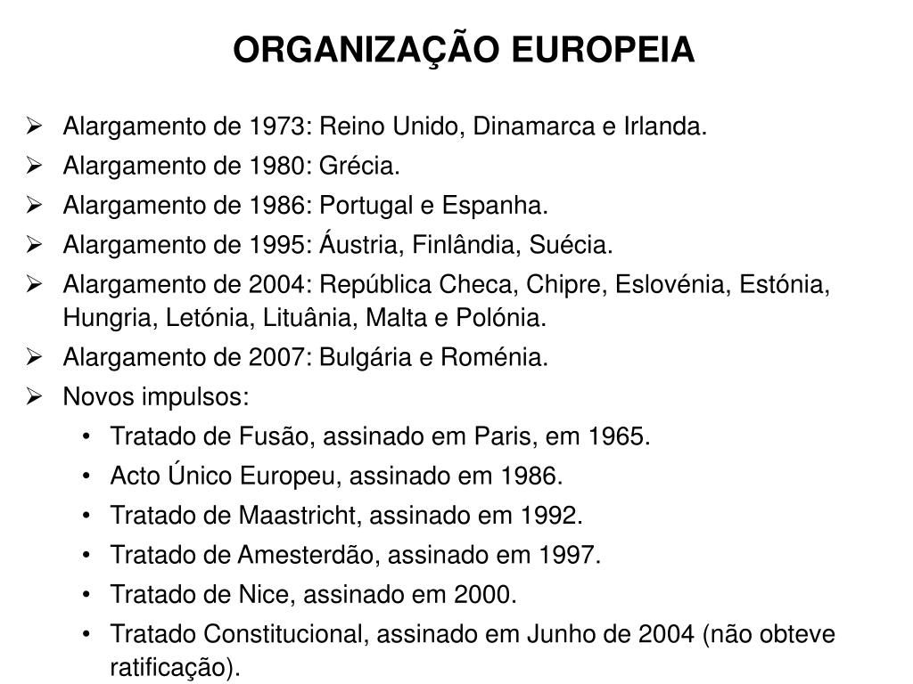 ORGANIZAÇÃO EUROPEIA • Alargamento de 1973: Reino Unido, Dinamarca e Irlanda. • Alargamento de 1980: Grécia. • Alargamento de 1986: Portugal e Espanha. • Alargamento de 1995: Áustria, Finlândia, Suécia. • Alargamento de 2004: República Checa, Chipre, Eslovénia, Estónia, Hungria, Letónia, Lituânia, Malta e Polónia. • Alargamento de 2007: Bulgária e Roménia. • Novos impulsos: • Tratado de Fusão, assinado em Paris, em 1965. • Acto Único Europeu, assinado em 1986. • Tratado de Maastricht, assinado em 1992. • Tratado de Amesterdão, assinado em 1997. • Tratado de Nice, assinado em 2000. • Tratado Constitucional, assinado em Junho de 2004 (não obteve ratificação).