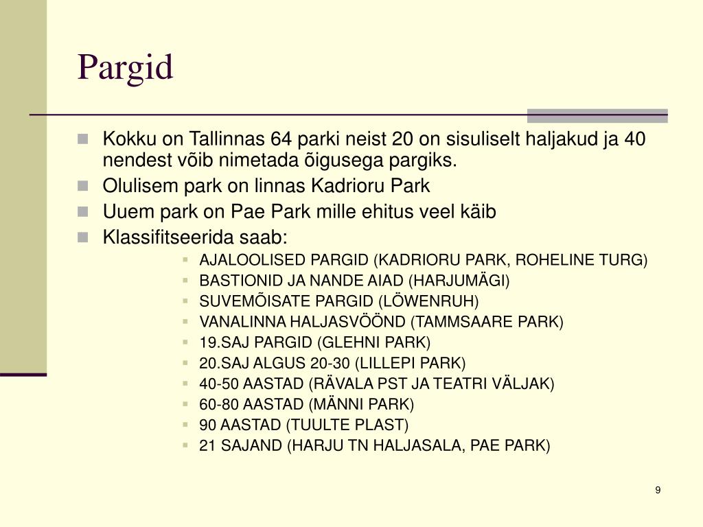 Pargid • Kokku on Tallinnas 64 parki neist 20 on sisuliselt haljakud ja 40 nendest võib nimetada õigusega pargiks. • Olulisem park on linnas Kadrioru Park • Uuem park on Pae Park mille ehitus veel käib • Klassifitseerida saab: • AJALOOLISED PARGID (KADRIORU PARK, ROHELINE TURG) • BASTIONID JA NANDE AIAD (HARJUMÄGI) • SUVEMÕISATE PARGID (LÖWENRUH) • VANALINNA HALJASVÖÖND (TAMMSAARE PARK) • 19.SAJ PARGID (GLEHNI PARK) • 20.SAJ ALGUS 20-30 (LILLEPI PARK) • 40-50 AASTAD (RÄVALA PST JA TEATRI VÄLJAK) • 60-80 AASTAD (MÄNNI PARK) • 90 AASTAD (TUULTE PLAST) • 21 SAJAND (HARJU TN HALJASALA, PAE PARK)