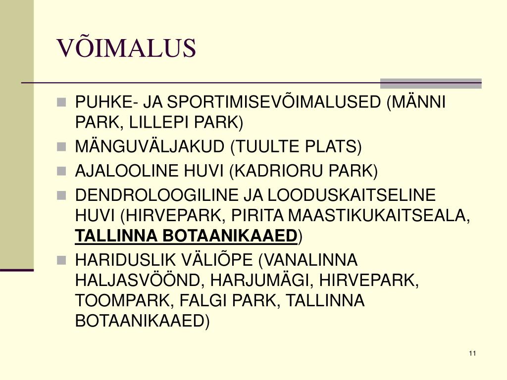 VÕIMALUS • PUHKE- JA SPORTIMISEVÕIMALUSED (MÄNNI PARK, LILLEPI PARK) • MÄNGUVÄLJAKUD (TUULTE PLATS) • AJALOOLINE HUVI (KADRIORU PARK) • DENDROLOOGILINE JA LOODUSKAITSELINE HUVI (HIRVEPARK, PIRITA MAASTIKUKAITSEALA, TALLINNA BOTAANIKAAED) • HARIDUSLIK VÄLIÕPE (VANALINNA HALJASVÖÖND, HARJUMÄGI, HIRVEPARK, TOOMPARK, FALGI PARK, TALLINNA BOTAANIKAAED)