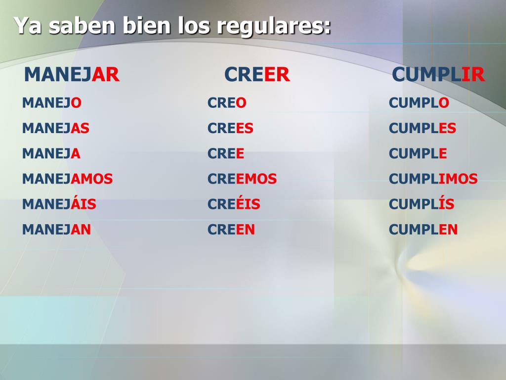 EL PRESENTE INDICATIVO. Ya saben bien los regulares:. MANEJ AR MANEJ O MANEJ AS MANEJ A MANEJ AMOS MANEJ Á IS MANEJ AN. CRE ER CRE O CRE ES CRE E CRE EMOS CRE ÉIS CRE EN. CUMPL IR CUMPL O CUMPL ES CUMPL E CUMPL IMOS CUMPL Í S CUMPL EN. ¿ …y los que cambian en la ra í z?.