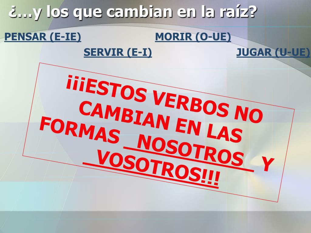 ¿…y los que cambian en la raíz? PENSAR (E-IE) MORIR (O-UE) SERVIR (E-I) JUGAR (U-UE) ¡¡¡ESTOS VERBOS NO CAMBIAN EN LAS FORMAS _NOSOTROS_ Y _VOSOTROS!!!