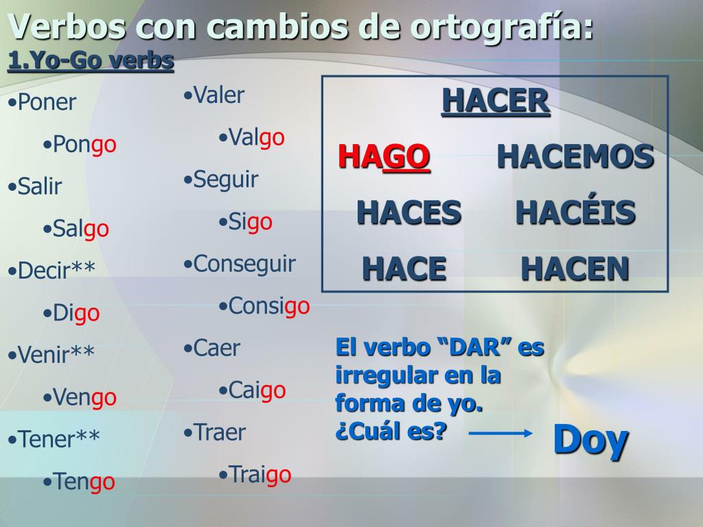Verbos con cambios de ortografía: • 1.Yo-Go verbs • Poner • Pongo • Salir • Salgo • Decir** • Digo • Venir** • Vengo • Tener** • Tengo • Valer • Valgo • Seguir • Sigo • Conseguir • Consigo • Caer • Caigo • Traer • Traigo HACER HAGO HACEMOS HACES HACÉIS HACE HACEN El verbo “DAR” es irregular en la forma de yo. ¿Cuál es? Doy