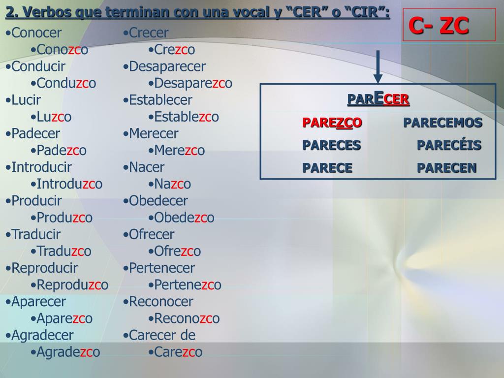 2. Verbos que terminan con una vocal y “CER” o “CIR”: C- ZC • Conocer • Conozco • Conducir • Conduzco • Lucir • Luzco • Padecer • Padezco • Introducir • Introduzco • Producir • Produzco • Traducir • Traduzco • Reproducir • Reproduzco • Aparecer • Aparezco • Agradecer • Agradezco • Crecer • Crezco • Desaparecer • Desaparezco • Establecer • Establezco • Merecer • Merezco • Nacer • Nazco • Obedecer • Obedezco • Ofrecer • Ofrezco • Pertenecer • Pertenezco • Reconocer • Reconozco • Carecer de • Carezco PARECER PAREZCO PARECEMOS PARECES PARECÉIS PARECE PARECEN
