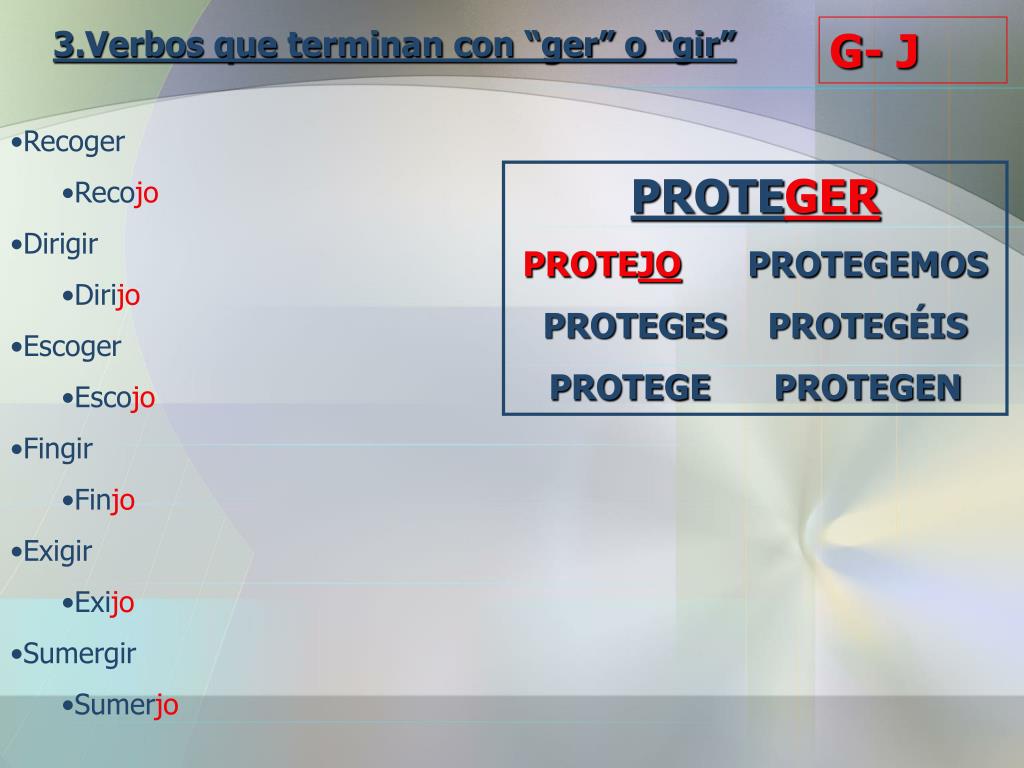 3.Verbos que terminan con “ger” o “gir” G- J • Recoger • Recojo • Dirigir • Dirijo • Escoger • Escojo • Fingir • Finjo • Exigir • Exijo • Sumergir • Sumerjo PROTEGER PROTEJO PROTEGEMOS PROTEGES PROTEGÉIS PROTEGE PROTEGEN
