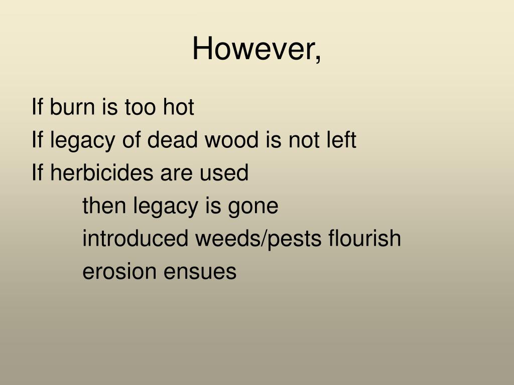 However, If burn is too hot If legacy of dead wood is not left If herbicides are used then legacy is gone introduced weeds/pests flourish erosion ensues
