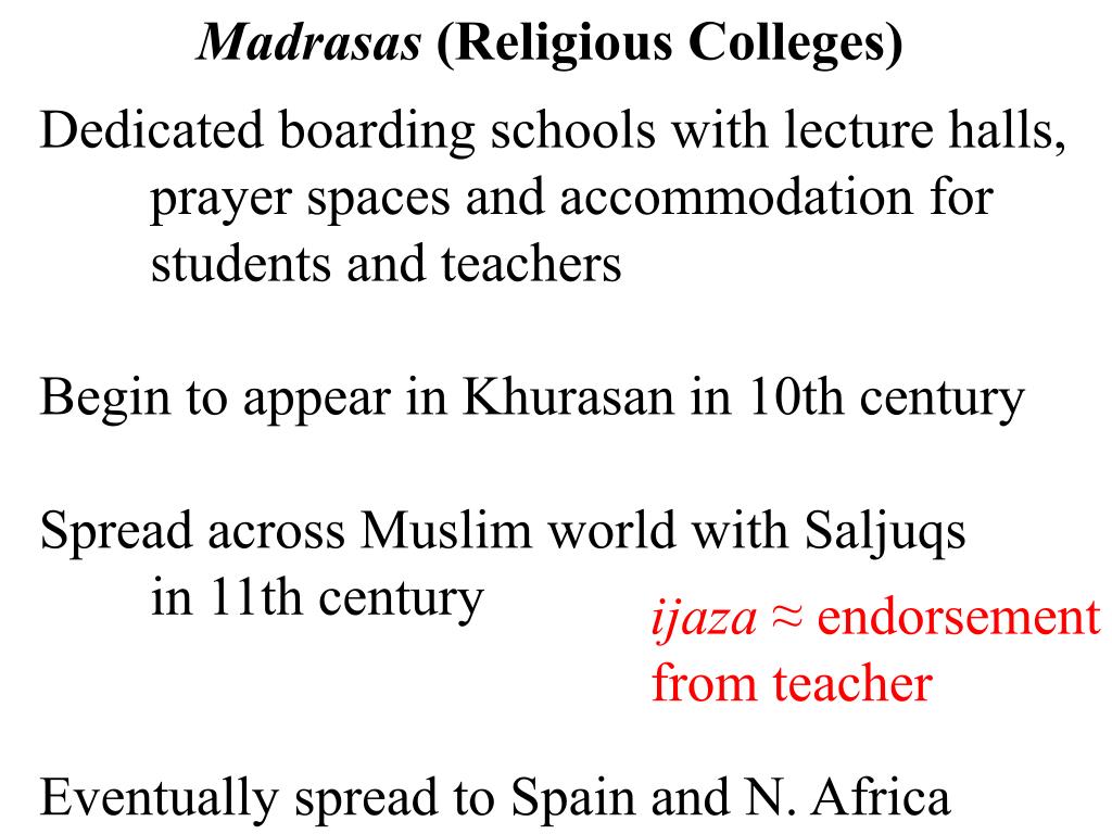 Madrasas (Religious Colleges) Dedicated boarding schools with lecture halls, prayer spaces and accommodation for students and teachers Begin to appear in Khurasan in 10th century Spread across Muslim world with Saljuqs in 11th century Eventually spread to Spain and N. Africa ijaza ≈ endorsement from teacher