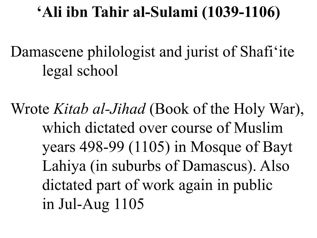 ‘Ali ibn Tahir al-Sulami (1039-1106) Damascene philologist and jurist of Shafi‘ite legal school Wrote Kitab al-Jihad (Book of the Holy War), which dictated over course of Muslim years 498-99 (1105) in Mosque of Bayt Lahiya (in suburbs of Damascus). Also dictated part of work again in public in Jul-Aug 1105