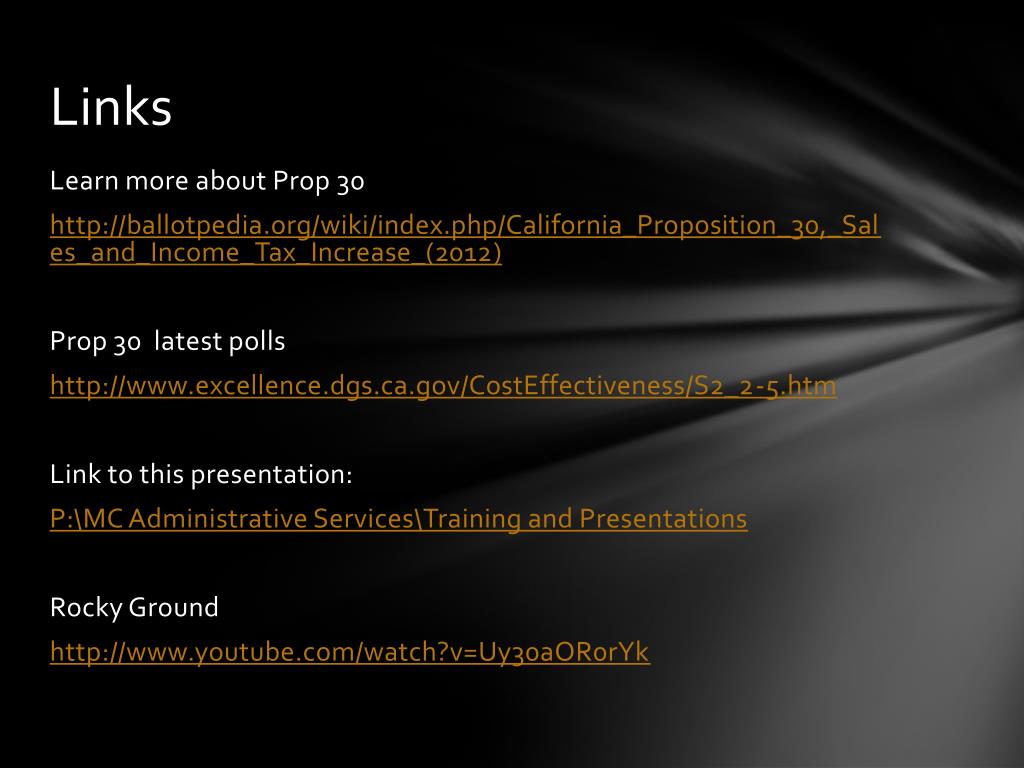 Links • Learn more about Prop 30 • http://ballotpedia.org/wiki/index.php/California_Proposition_30,_Sales_and_Income_Tax_Increase_(2012) • Prop 30 latest polls • http://www.excellence.dgs.ca.gov/CostEffectiveness/S2_2-5.htm • Link to this presentation: • P:\MC Administrative Services\Training and Presentations • Rocky Ground • http://www.youtube.com/watch?v=Uy30aOR0rYk