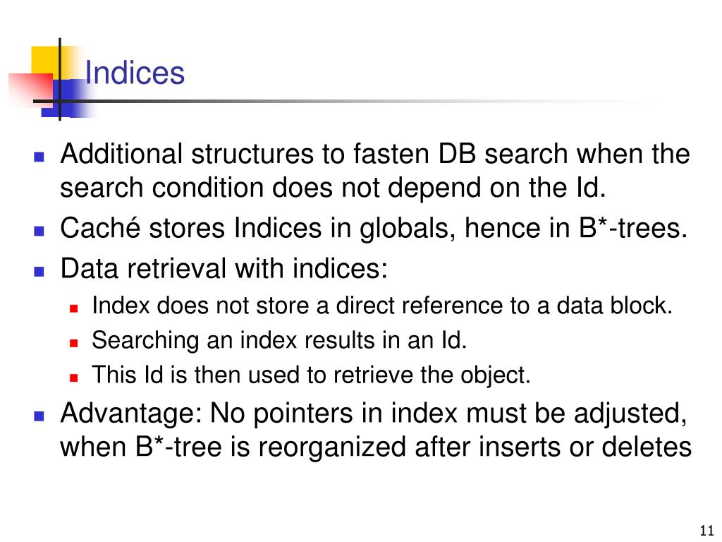 Indices • Additional structures to fasten DB search when the search condition does not depend on the Id. • Caché stores Indices in globals, hence in B*-trees. • Data retrieval with indices: • Index does not store a direct reference to a data block. • Searching an index results in an Id. • This Id is then used to retrieve the object. • Advantage: No pointers in index must be adjusted, when B*-tree is reorganized after inserts or deletes
