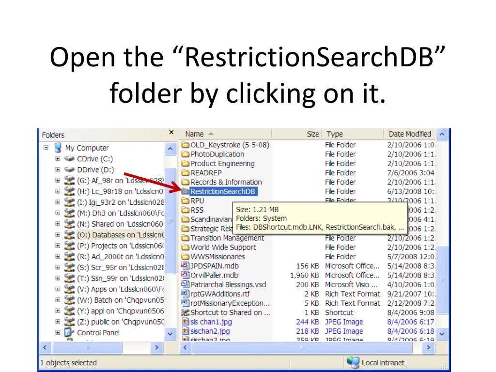 Step 1: • Contact the TSRs and request that the new team member or missionary get access to the “RestrictionSearchDB” folder located on the “O:” drive. • Once the “RestrictionSearchDB” folder appears on the individual’s “O:” drive, proceed with the following steps.