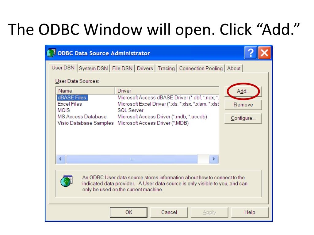 Click on the Start Menu, “Programs,” “Administrative Tools,” and then “Data Sources (ODBC)”