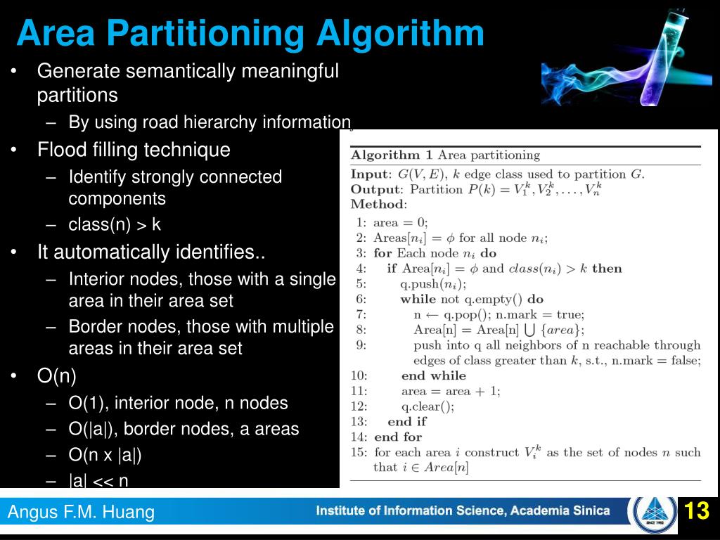 Area Partitioning Algorithm • Generate semantically meaningful partitions • By using road hierarchy information • Flood filling technique • Identify strongly connected components • class(n) > k • It automatically identifies.. • Interior nodes, those with a single area in their area set • Border nodes, those with multiple areas in their area set • O(n) • O(1), interior node, n nodes • O(|a|), border nodes, a areas • O(n x |a|) • |a| << n