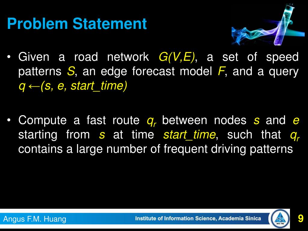 Problem Statement • Given a road network G(V,E), a set of speed patterns S, an edge forecast model F, and a query q ←(s, e, start_time) • Compute a fast route qrbetween nodes s and e starting from s at time start_time, such that qrcontains a large number of frequent driving patterns