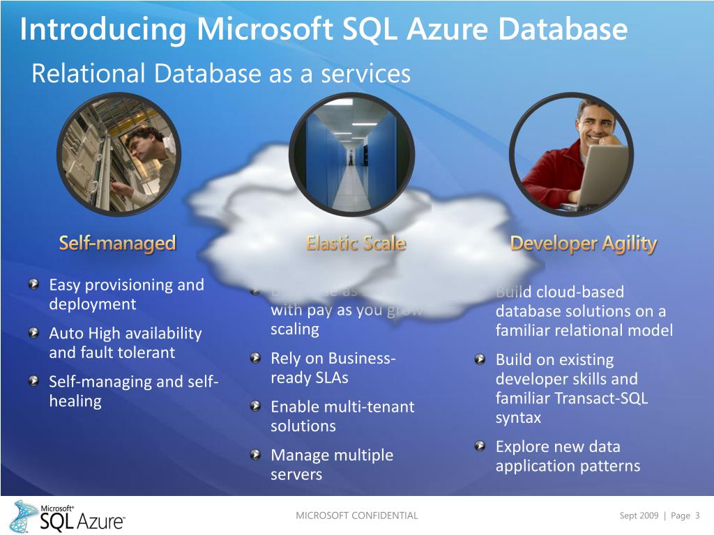 Introducing Microsoft SQL Azure Database Relational Database as a services Self-managed Elastic Scale Developer Agility Easy provisioning and deployment Auto High availability and fault tolerant Self-managing and self-healing • Database as a utility with pay as you grow scaling • Rely on Business-ready SLAs • Enable multi-tenant solutions • Manage multiple servers Build cloud-based database solutions on a familiar relational model Build on existing developer skills and familiar Transact-SQL syntax Explore new data application patterns