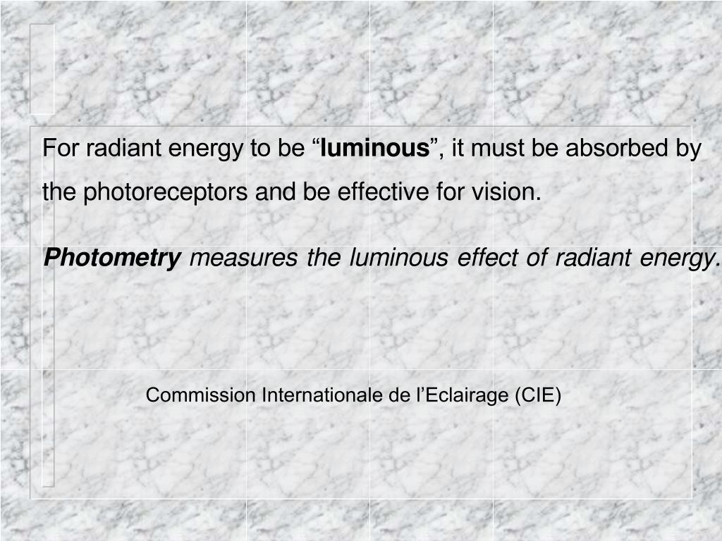 Where vision is concerned, light is generally specified in photometric units, not in quanta (photons) and energy. Commission Internationale de l’Eclairage (CIE).