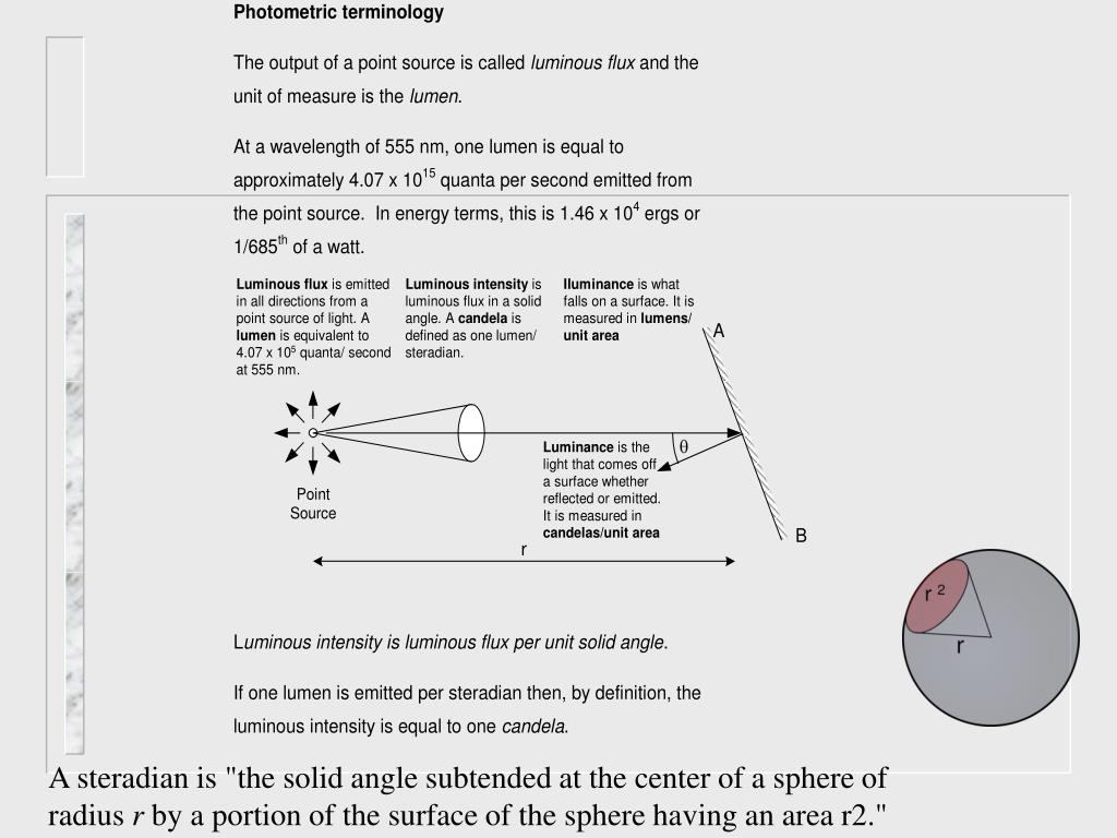 Luminous flux Luminous intensity iIluminance is emitted is is what in all directions from a luminous flux in a solid falls on a surface. It is candela lumens/ point source of light. A angle. A is measured in A lumen unit area is equivalent to defined as one lumen/ 15 4.07 x 10 quanta/ second steradian. at 555 nm. q Luminance is the light that comes off a surface whether Point reflected or emitted. Source It is measured in candelas/unit area B r