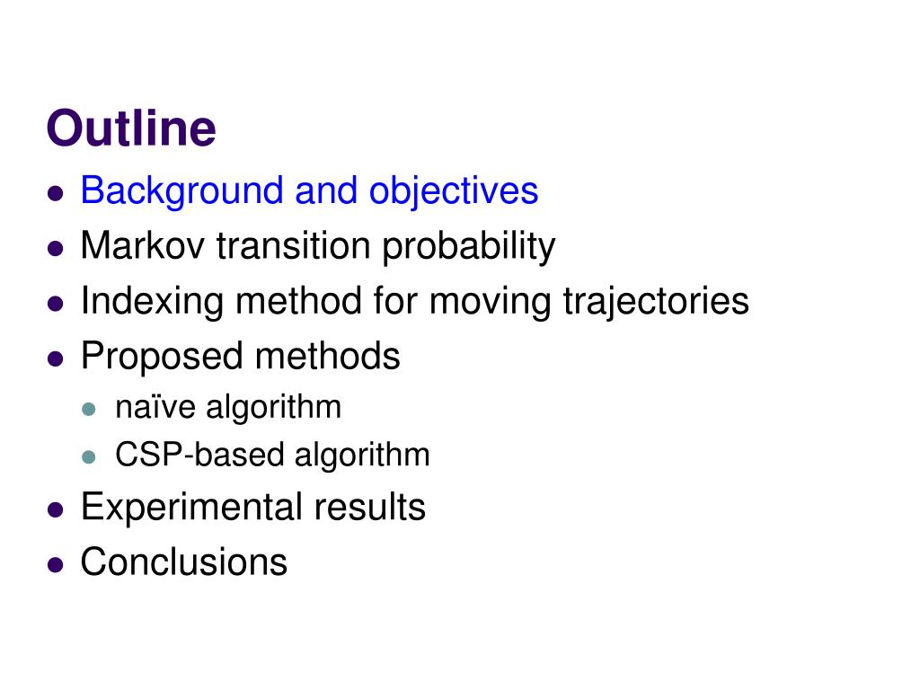 Outline • Background and objectives • Markov transition probability • Indexing method for moving trajectories • Proposed methods • naïve algorithm • CSP-based algorithm • Experimental results • Conclusions