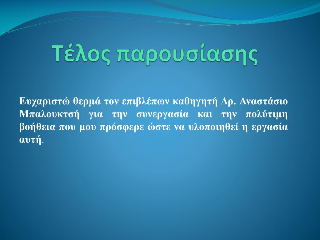 Τέλος παρουσίασης Ευχαριστώ θερμά τον επιβλέπων καθηγητή Δρ. Αναστάσιο Μπαλουκτσή για την συνεργασία και την πολύτιμη βοήθεια που μου πρόσφερε ώστε να υλοποιηθεί η εργασία αυτή.