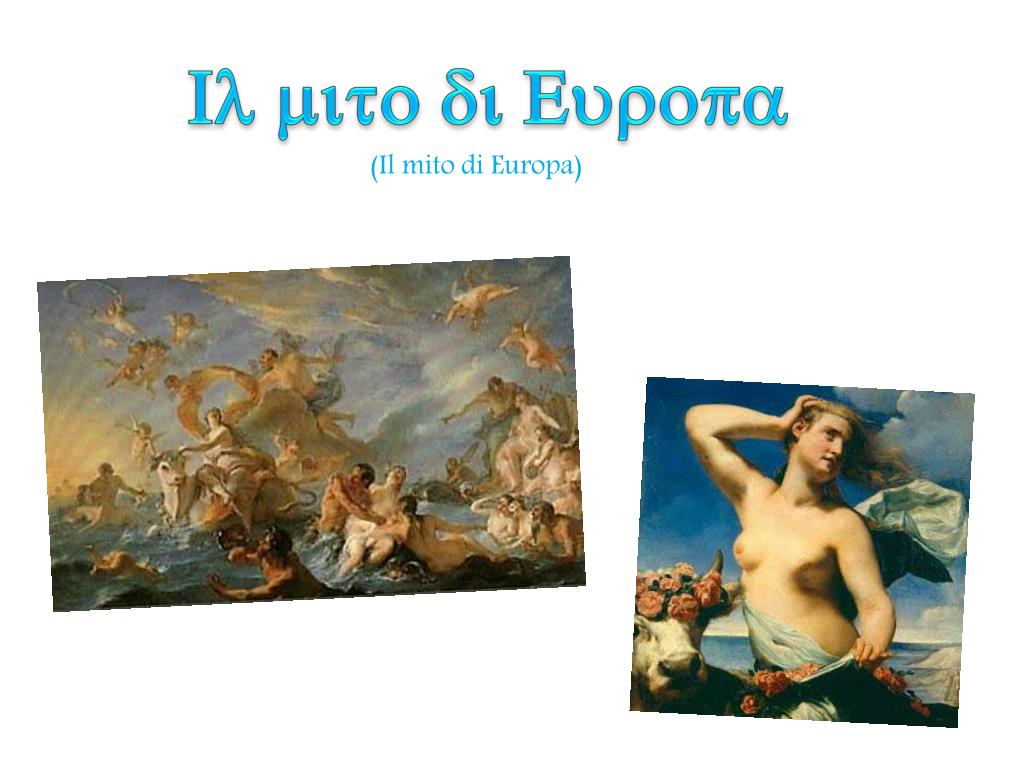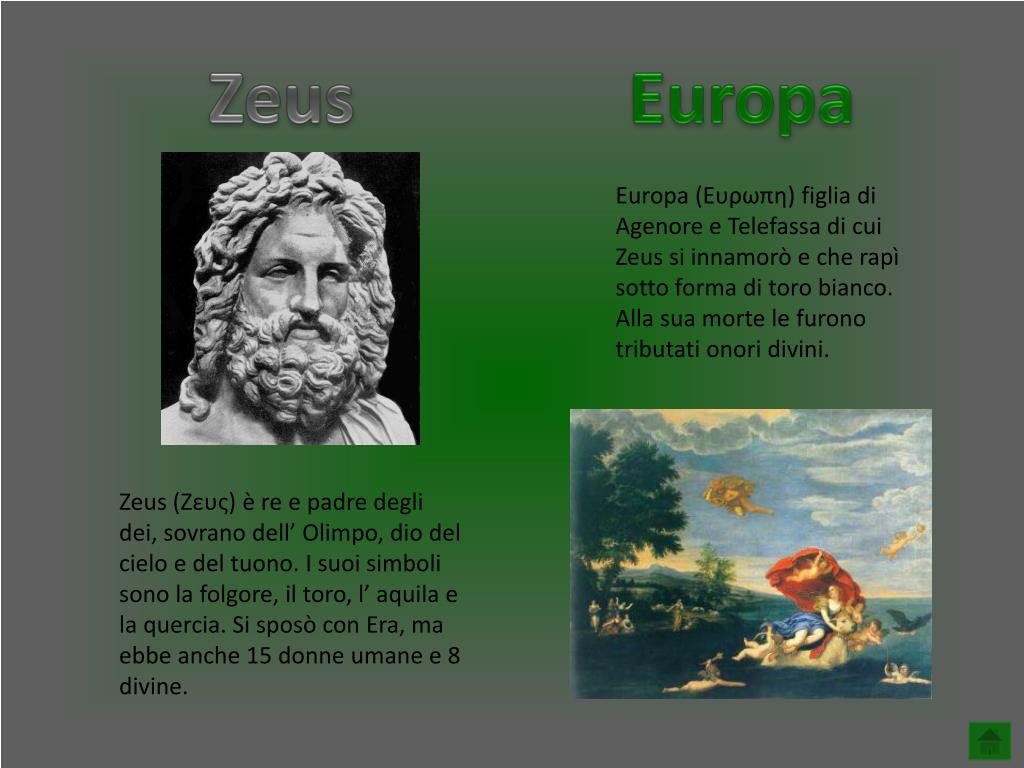 Zeus Europa Europa (Ευρωπη) figlia di Agenore e Telefassa di cui Zeus si innamorò e che rapì sotto forma di toro bianco. Alla sua morte le furono tributati onori divini. Zeus (Ζευς) è re e padre degli dei, sovrano dell’ Olimpo, dio del cielo e del tuono. I suoi simboli sono la folgore, il toro, l’ aquila e la quercia. Si sposò con Era, ma ebbe anche 15 donne umane e 8 divine.