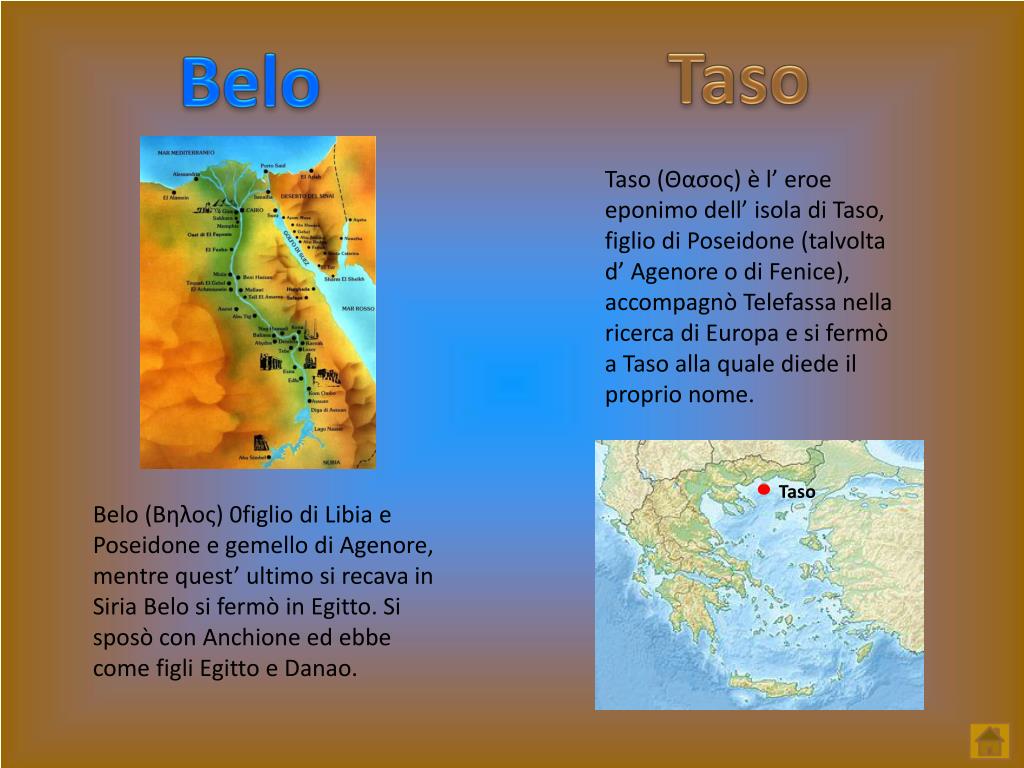 Taso Belo Taso (Θασος) è l’ eroe eponimo dell’ isola di Taso, figlio di Poseidone (talvolta d’ Agenore o di Fenice), accompagnò Telefassa nella ricerca di Europa e si fermò a Taso alla quale diede il proprio nome. Taso Belo (Βηλος) 0figlio di Libia e Poseidone e gemello di Agenore, mentre quest’ ultimo si recava in Siria Belo si fermò in Egitto. Si sposò con Anchione ed ebbe come figli Egitto e Danao.