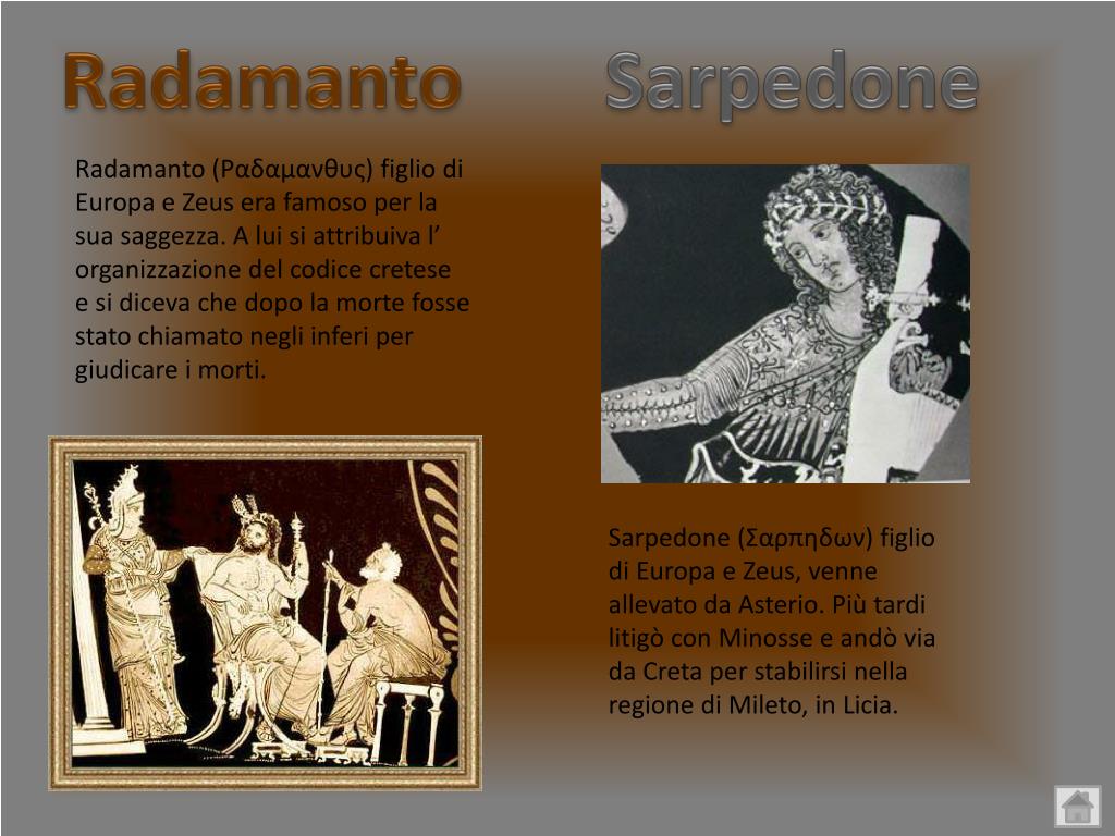 Radamanto Sarpedone Radamanto (Ραδαμανθυς) figlio di Europa e Zeus era famoso per la sua saggezza. A lui si attribuiva l’ organizzazione del codice cretese e si diceva che dopo la morte fosse stato chiamato negli inferi per giudicare i morti. Sarpedone (Σαρπηδων) figlio di Europa e Zeus, venne allevato da Asterio. Più tardi litigò con Minosse e andò via da Creta per stabilirsi nella regione di Mileto, in Licia.
