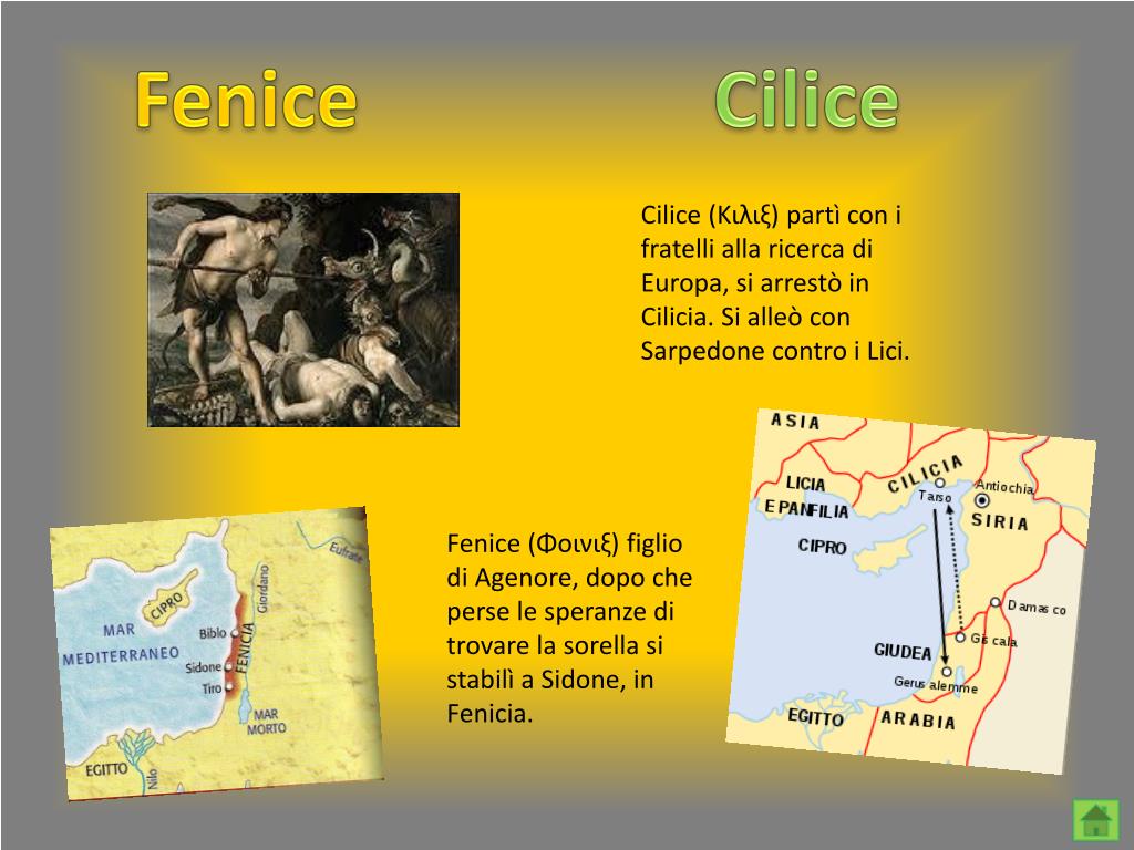 Fenice Cilice Cilice (Κιλιξ) partì con i fratelli alla ricerca di Europa, si arrestò in Cilicia. Si alleò con Sarpedone contro i Lici. Fenice (Φοινιξ) figlio di Agenore, dopo che perse le speranze di trovare la sorella si stabilì a Sidone, in Fenicia.
