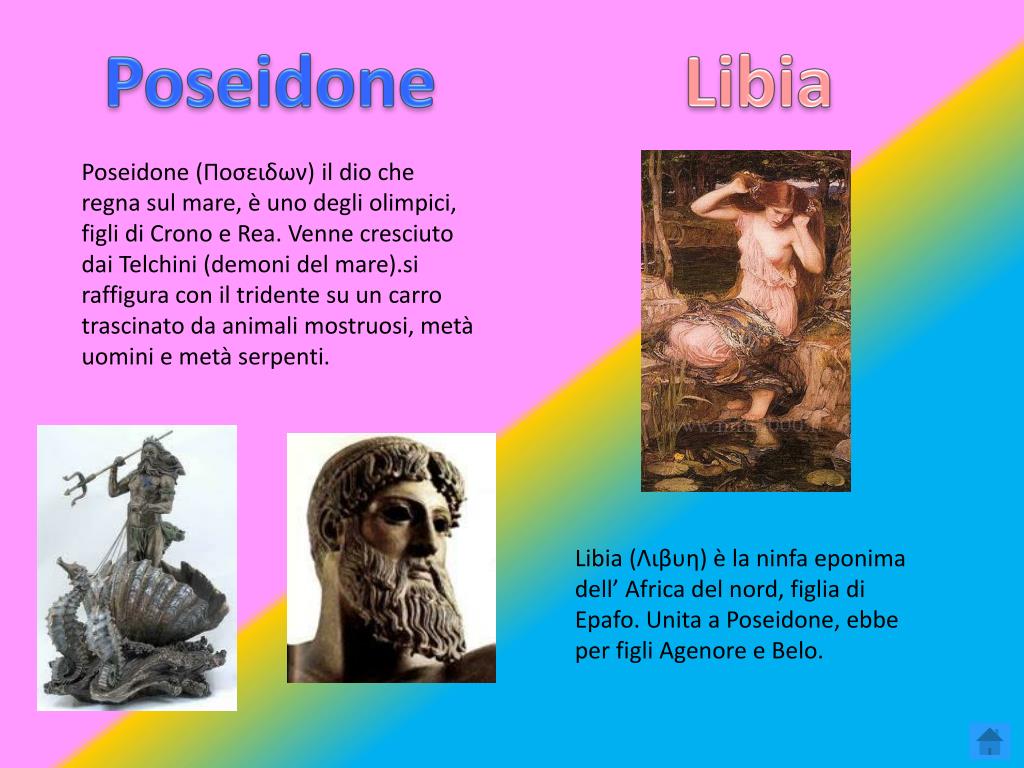 Poseidone Libia Poseidone (Ποσειδων) il dio che regna sul mare, è uno degli olimpici, figli di Crono e Rea. Venne cresciuto dai Telchini (demoni del mare).si raffigura con il tridente su un carro trascinato da animali mostruosi, metà uomini e metà serpenti. Libia (Λιβυη) è la ninfa eponima dell’ Africa del nord, figlia di Epafo. Unita a Poseidone, ebbe per figli Agenore e Belo.