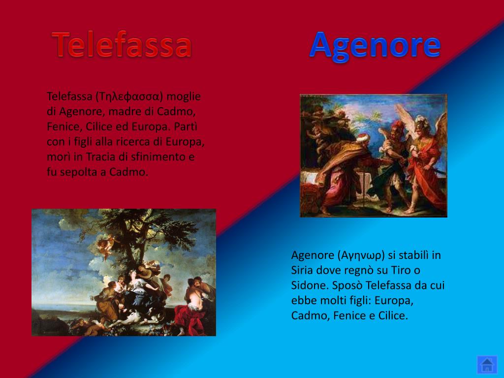 Telefassa Agenore Telefassa (Τηλεφασσα) moglie di Agenore, madre di Cadmo, Fenice, Cilice ed Europa. Partì con i figli alla ricerca di Europa, morì in Tracia di sfinimento e fu sepolta a Cadmo. Agenore (Αγηνωρ) si stabilì in Siria dove regnò su Tiro o Sidone. Sposò Telefassa da cui ebbe molti figli: Europa, Cadmo, Fenice e Cilice.
