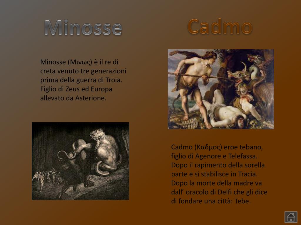 Cadmo Minosse Minosse (Μινως) è il re di creta venuto tre generazioni prima della guerra di Troia. Figlio di Zeus ed Europa allevato da Asterione. Cadmo (Καδμος) eroe tebano, figlio di Agenore e Telefassa. Dopo il rapimento della sorella parte e si stabilisce in Tracia. Dopo la morte della madre va dall’ oracolo di Delfi che gli dice di fondare una città: Tebe.
