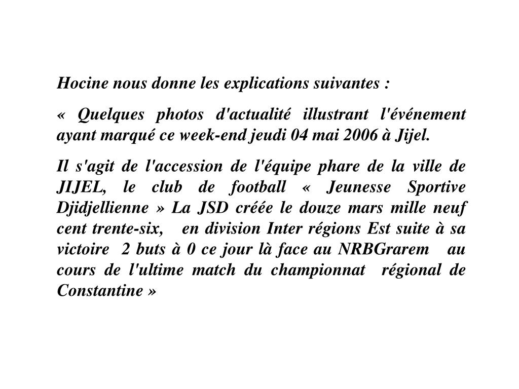 Hocine nous donne les explications suivantes : « Quelques photos d'actualité illustrant l'événement ayant marqué ce week-end jeudi 04 mai 2006 à Jijel. Il s'agit de l'accession de l'équipe phare de la ville de JIJEL, le club de football « Jeunesse Sportive Djidjellienne » La JSD créée le douze mars mille neuf cent trente-six, en division Inter régions Est suite à sa victoire 2 buts à 0 ce jour là face au NRBGrarem au cours de l'ultime match du championnat régional de Constantine »