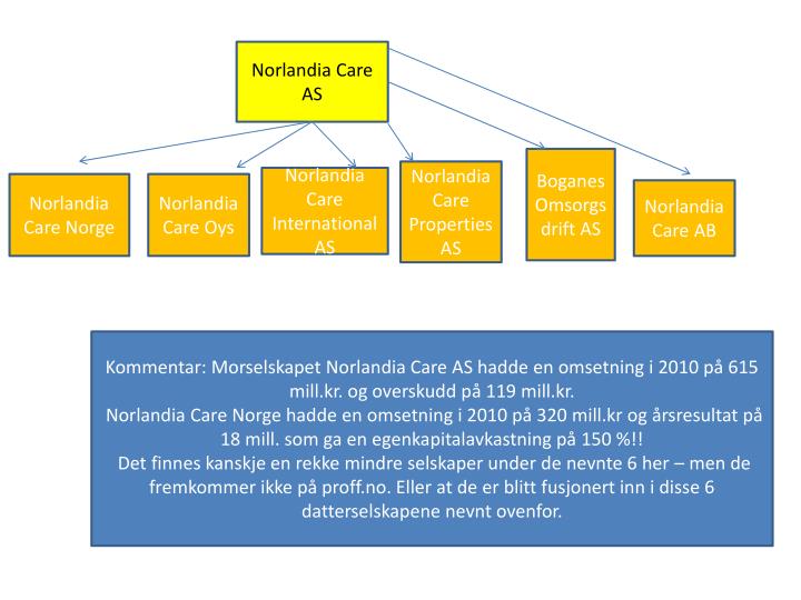 NorlandiaCare AS Boganes Omsorgsdrift AS NorlandiaCare Properties AS NorlandiaCare International AS NorlandiaCare Norge NorlandiaCareOys NorlandiaCare AB Kommentar: Morselskapet NorlandiaCare AS hadde en omsetning i 2010 på 615 mill.kr. og overskudd på 119 mill.kr. NorlandiaCare Norge hadde en omsetning i 2010 på 320 mill.kr og årsresultat på 18 mill. som ga en egenkapitalavkastning på 150 %!! Det finnes kanskje en rekke mindre selskaper under de nevnte 6 her – men de fremkommer ikke på proff.no. Eller at de er blitt fusjonert inn i disse 6 datterselskapene nevnt ovenfor.