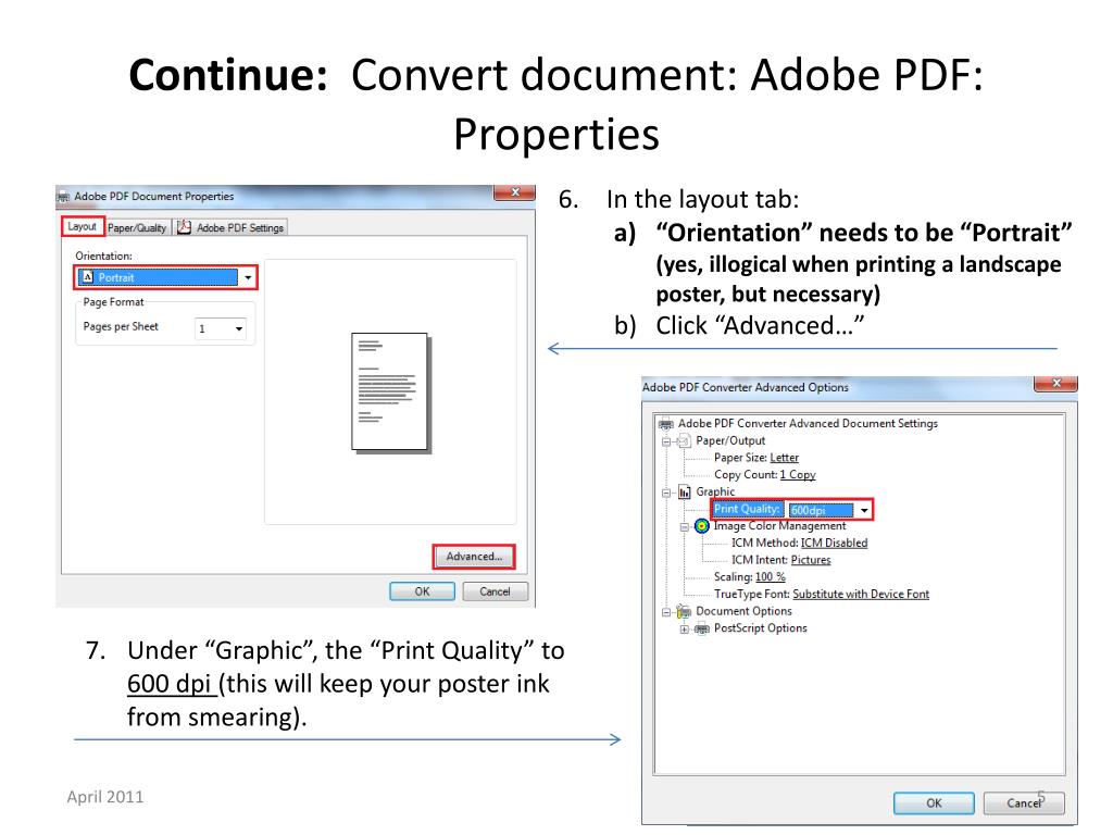 Continue: Convert document: Adobe PDF: Properties • In the layout tab: • “Orientation” needs to be “Portrait” (yes, illogical when printing a landscape poster, but necessary) • Click “Advanced…” Under “Graphic”, the “Print Quality” to 600 dpi (this will keep your poster ink from smearing).