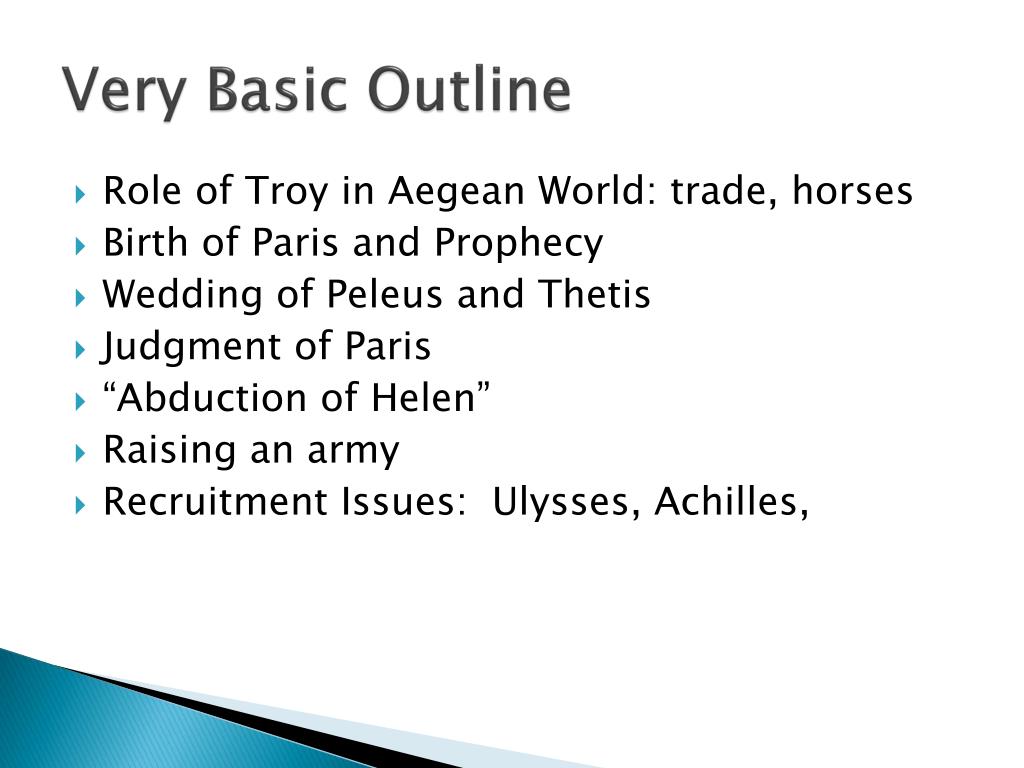 Very Basic Outline • Role of Troy in Aegean World: trade, horses • Birth of Paris and Prophecy • Wedding of Peleus and Thetis • Judgment of Paris • “Abduction of Helen” • Raising an army • Recruitment Issues: Ulysses, Achilles,