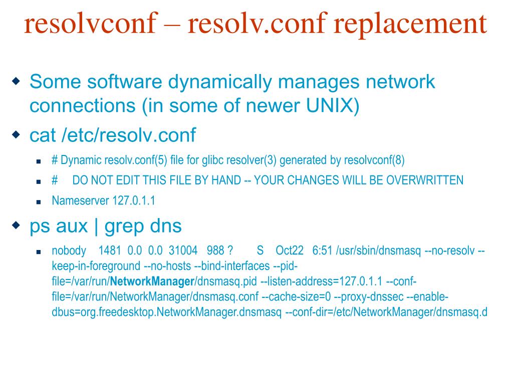 resolvconf – resolv.conf replacement Some software dynamically manages network connections (in some of newer UNIX) cat /etc/resolv.conf # Dynamic resolv.conf(5) file for glibc resolver(3) generated by resolvconf(8) # DO NOT EDIT THIS FILE BY HAND -- YOUR CHANGES WILL BE OVERWRITTEN Nameserver 127.0.1.1 ps aux | grep dns nobody 1481 0.0 0.0 31004 988 ? S Oct22 6:51 /usr/sbin/dnsmasq --no-resolv --keep-in-foreground --no-hosts --bind-interfaces --pid-file=/var/run/NetworkManager/dnsmasq.pid --listen-address=127.0.1.1 --conf-file=/var/run/NetworkManager/dnsmasq.conf --cache-size=0 --proxy-dnssec --enable-dbus=org.freedesktop.NetworkManager.dnsmasq --conf-dir=/etc/NetworkManager/dnsmasq.d