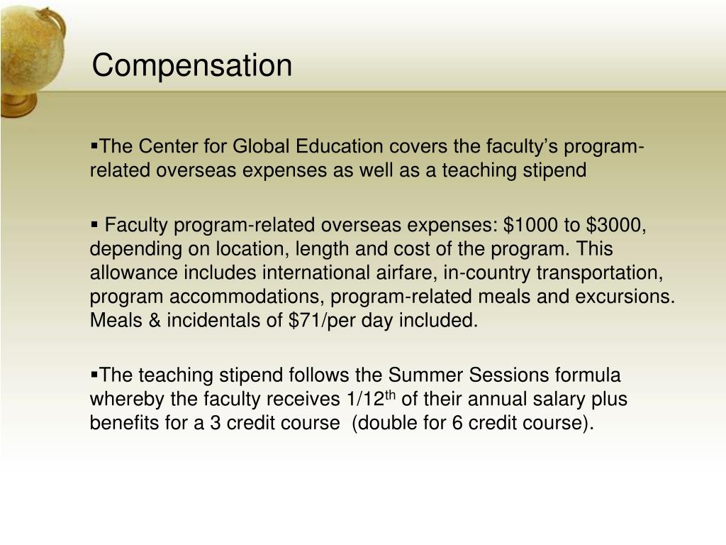 Compensation • The Center for Global Education covers the faculty’s program-related overseas expenses as well as a teaching stipend • Faculty program-related overseas expenses: $1000 to $3000, depending on location, length and cost of the program. This allowance includes international airfare, in-country transportation, program accommodations, program-related meals and excursions. Meals & incidentals of $71/per day included. • The teaching stipend follows the Summer Sessions formula whereby the faculty receives 1/12th of their annual salary plus benefits for a 3 credit course (double for 6 credit course).